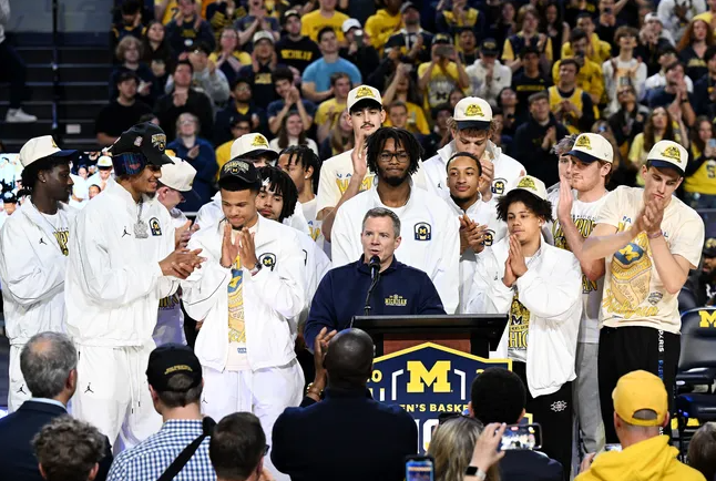 Michigan head coach Dusty May speaks surrounded by the team during the celebration for the 2026 ...