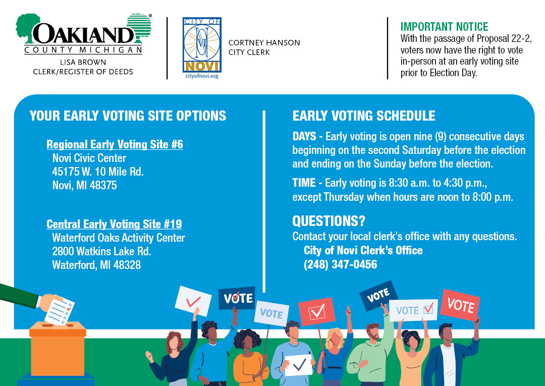 All eligible voters can vote early at the Novi Civic Center from October 28 through November 5 from 8:30 am to 4:30 pm, except November 2, when hours will be noon to 8 pm. Absentee ballots are also still available leading up to election day. If you are planning to vote in person on November 7, be sure to visit your assigned polling location from 7 am to 8 pm. You can verify your voter registration, apply for an absentee ballot, and confirm your polling location at Michigan.gov/vote.