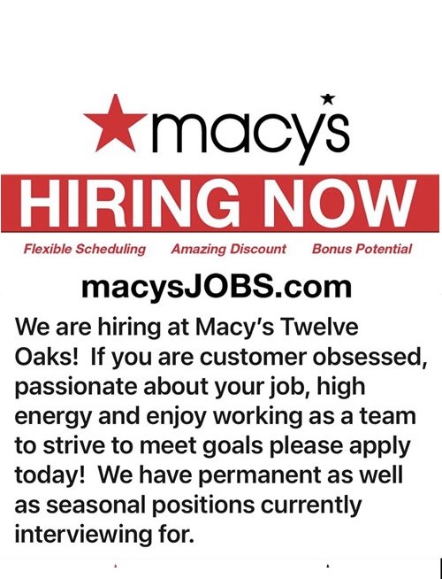 Macys Twelve Oaks is Hiring