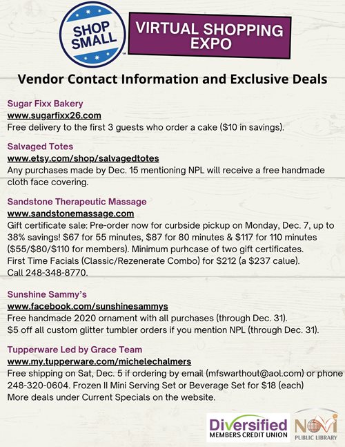Support local businesses this holiday season and shop small! Check out these awesome discounts from businesses featured in the Novi Public Library's Shop Small Virtual Shopping Expo last Saturday.