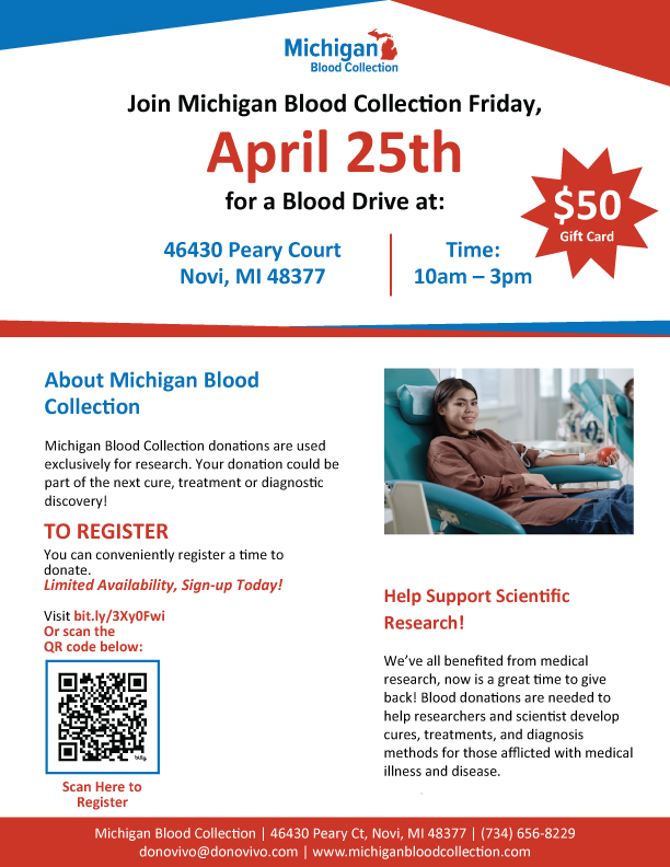 We’ve all benefited from medical research, now is a great time to give back! Blood donations are needed to help researchers and scientist develop cures, treatments, and diagnosis methods for those afflicted with medical illness and disease. Donations are quick and easy, and every Michigan Blood Collection blood donor will be compensated for their time with a $50 gift card. Follow the instructions on this page to register. Walk-ins welcome, advance registration is recommended.