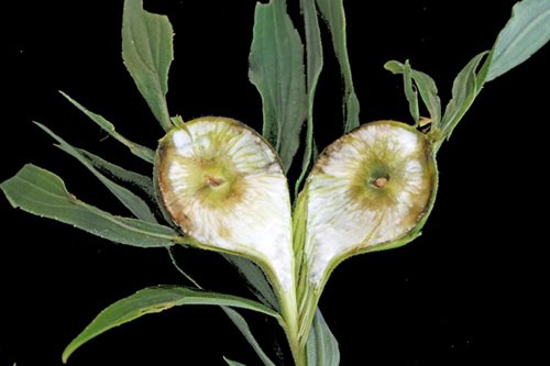- Goldenrod Gall: Instead of being at the end of the plant, this insect lays its egg and injects hormones into the stem of a goldenrod which gradually forms a growth (gall) around the egg and gets as large as a golf ball. Sometimes birds or other insects will dig into the gall to eat the larvae, but the lucky larvae will develop into the fly in the photo.