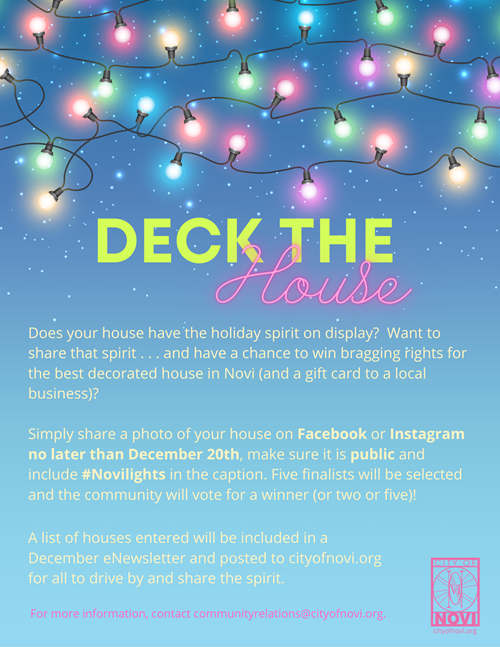 With that in mind, the City has come up with a “Deck the House” campaign to encourage residents to decorate their homes for the holidays and win bragging rights for the best decorated house in Novi. They are asking that residents share a photo of their house on Facebook or Instagram no later than Dec. 20 using the hashtag #NoviLights in the caption (make sure your post is public). Five finalists will be selected, and the community will vote on social media for a winner. The winner or winners will receive a gift card to a local business.
