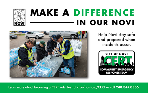 Give back to the City of Novi and learn how to help your family and others in a time of need by becoming a member of the Community Emergency Response Team (CERT). As a CERT volunteer you may be used for various assignments, which may include emergency deployment for local, county, state, or even national activation. In addition to these duties, team members will also act as an ambassador for the City of Novi.