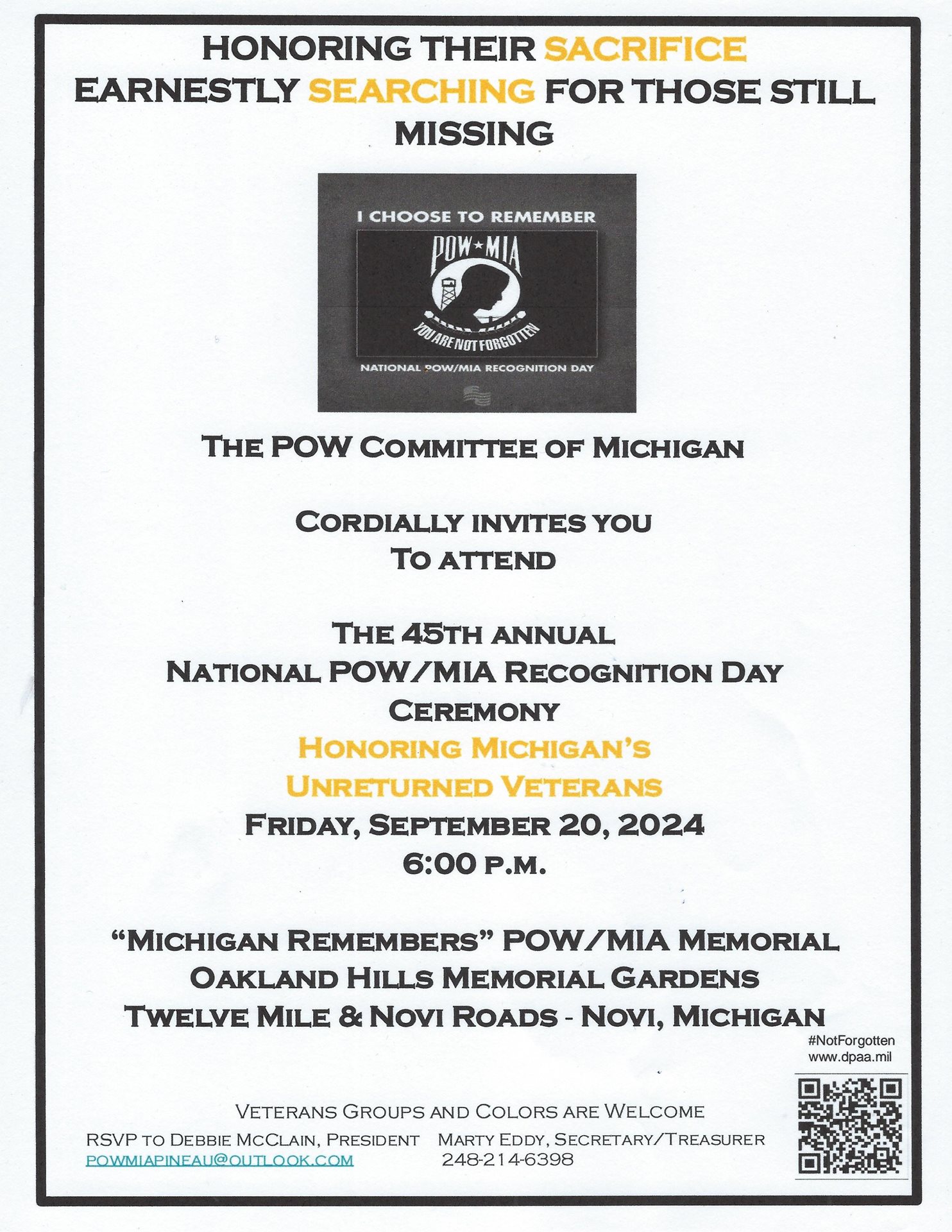 The POW Committee of Michigan cordially invites you to attend the 45th annual Nation POW/MIA Recognition Day Ceremony honoring Michigan's unreturned veterans Friday, September 20, 2024 at 6pm at Oakland Hills Memorial Gardens. Click for event flyer.