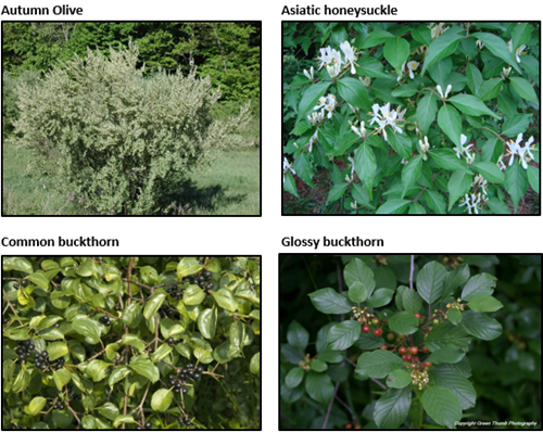 Plants such as common buckthorn, glossy buckthorn, Asian honeysuckle, autumn olive, privet and Oriental bittersweet all originated in Asia or Europe, and were brought to the United States for various reasons. While they may have been planted somewhere intentionally, most have been spread by birds who eat the berries and drop the seeds as they fly about and perch in trees. The first five species mentioned are small trees or large shrubs that spread rapidly, put out lots of seeds and sometimes are so dense that they crowd out native plants (shrubs, trees and wildflowers), changing healthy habitats into green ecological deserts.