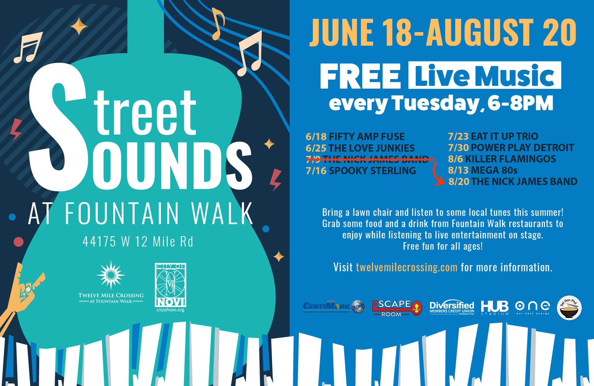 What a magical summer of music it’s been! As we wrap up Street Sounds at Fountain Walk, don’t miss our final concert featuring Nick James Music, bringing a soulful twist to your favorite pop hits. Date: Tuesday, August 20th from 6-8 PM. Where: Outdoor center circle near the @The HUB Stadium Novi Bring your own chair, and enjoy great food and drinks from our local restaurants while soaking in the last tunes of the season. Rain or shine, the party goes on! If it rains, we'll move the fun indoors to The HUB Stadium's 2nd floor music lounge.