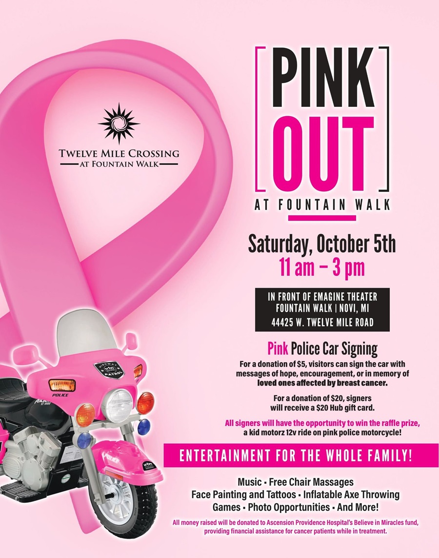 PINK OUT AT Twelve Mile Crossing at Fountain Walk! π Saturday, October 5th, 11-3pm in front of Emagine Theater (44425 W. 12 Mile Rd., Novi) Make your mark on a pink police car for just $5 and leave messages of hope. Donate $20+ and get a $20 The HUB Stadium Novi gift card! π All signers get entered for a chance to win a $300 kids pink police motorcycle! Family fun, games, and more! πΆπ Most activities are FREE, but we happily accept donations to support the Ascension Providence Hospital Believe in Miracles Fund, which provides cancer patients with financial assistance. Let's make a difference together!
