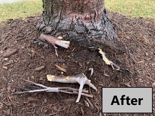 These roots can often be traced back to improper planting technique. Simple planting mistakes may not manifest as problematic girdling roots for many years, however, and by that point it may be too late to correct the damage. That’s why early detection of girdling roots is vital. A trunk that doesn’t flare out near the ground is a good indicator that a tree may be dealing with girdling roots just beneath the surface. If the tree looks like a telephone pole entering the ground, gentle excavation around the base of the trunk may reveal potential problems.