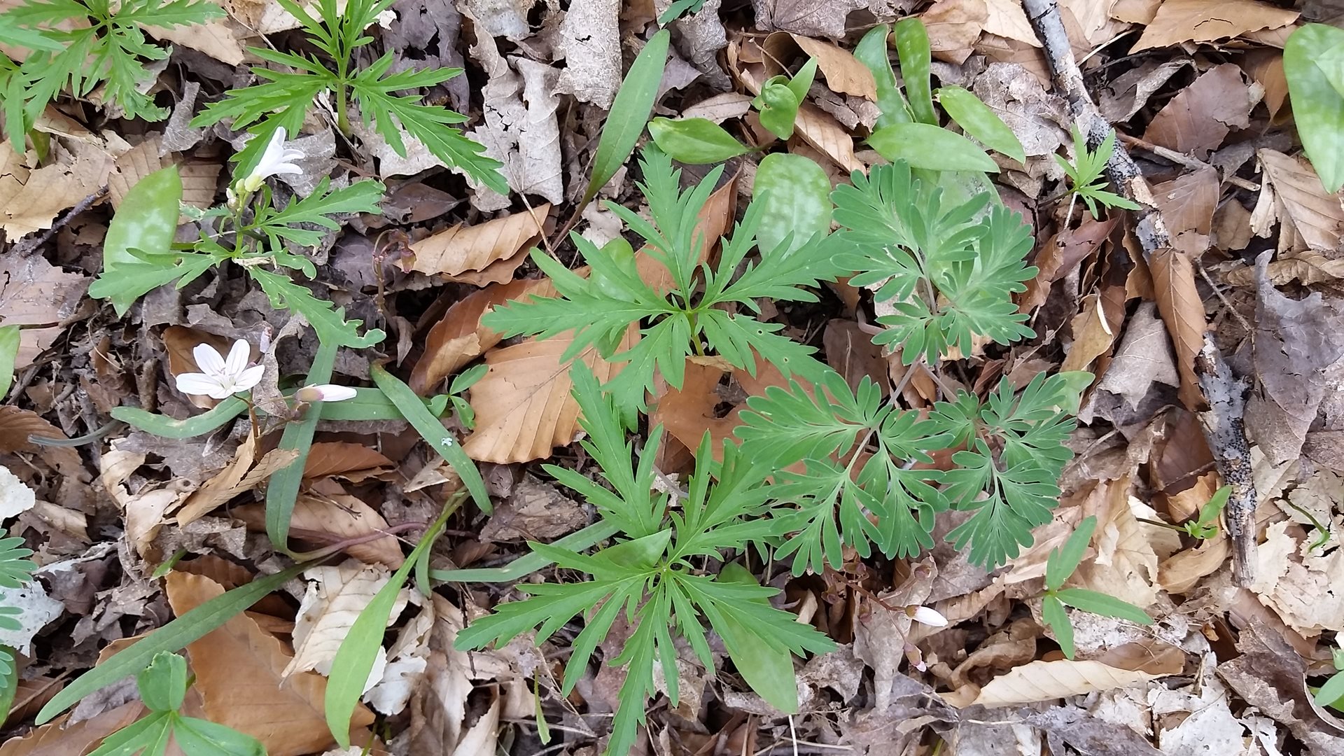 • Toothwort – the leaves are very segmented and the white flowers rise about 9” above the ground