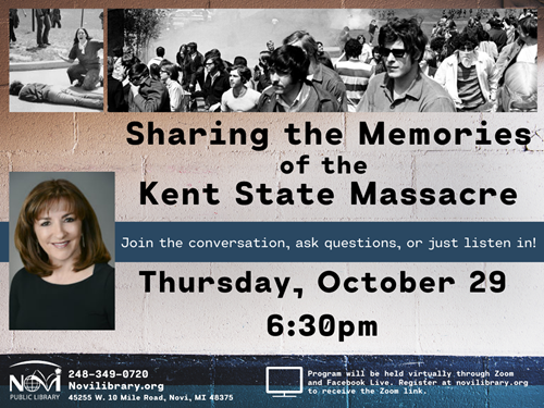 11th Annual Community Reads, the Novi Public Library is hosting Roseanna "Chic" Canfora, Adjunct Professor of Journalism at Kent State, and eyewitness and survivor of the shootings at Kent State University on May 4, 1970, in a special virtual program on Thursday, October 29 at 6:30pm.