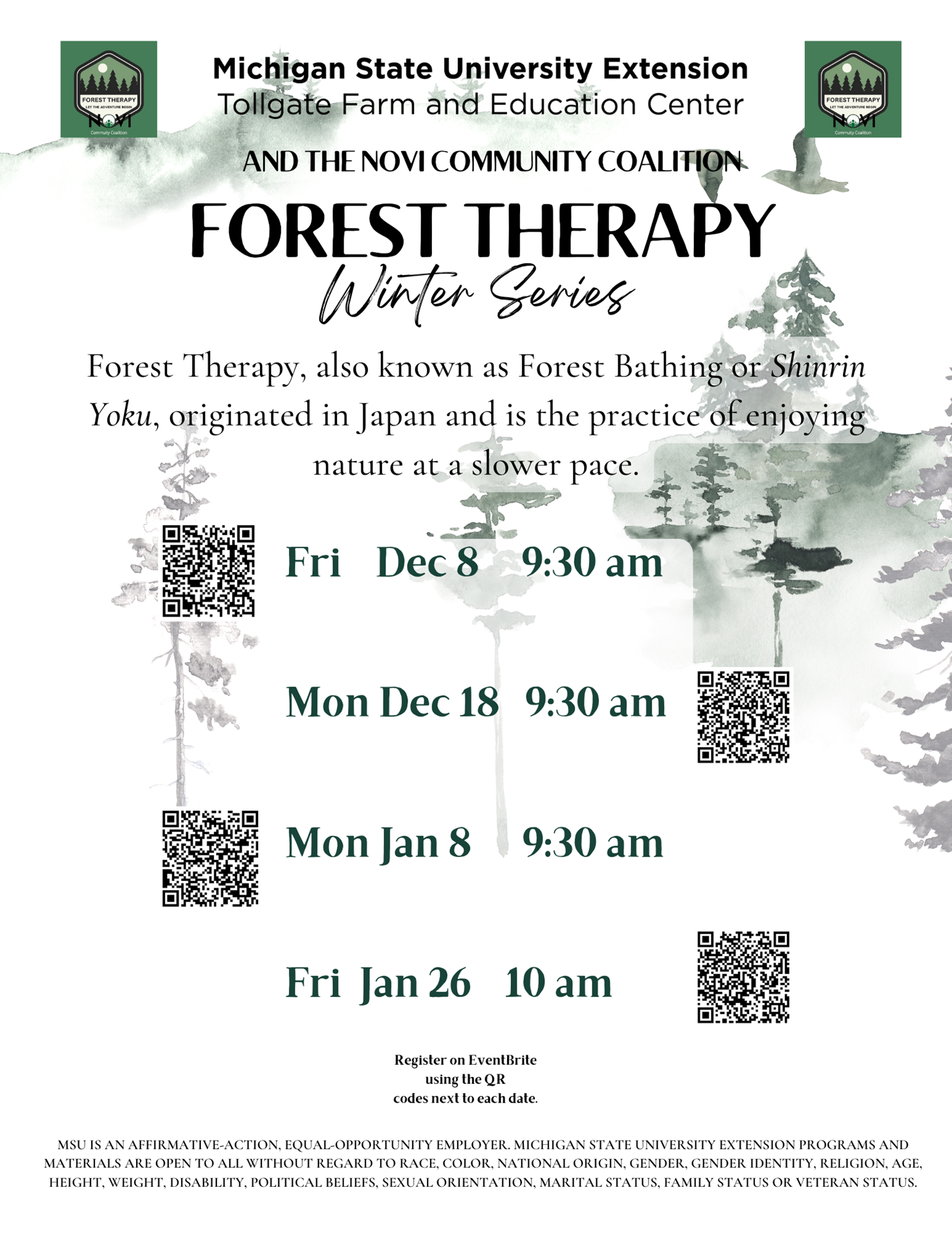 Come to Tollgate Farm this Friday, December 8th, 9:30-11 am, for some wellness in the winter woods. Forest Therapy, also known as Forest Bathing or Shinrin Yoku, originated in Japan and is the practice of enjoying nature at a slower pace. MSU Extension Tollgate Farm and The Novi Community Coalition have partnered to present Forest Therapy experiences to the public! Preregistration is required.